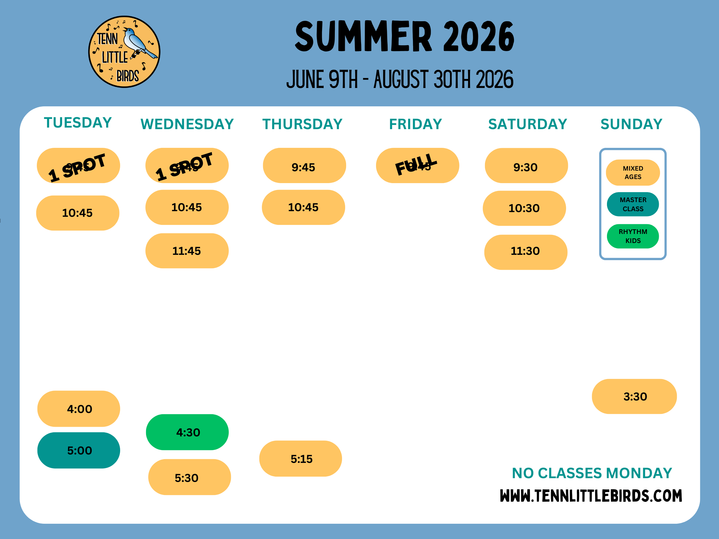 Summer at Tenn Little Birds is designed to support your family’s rhythm with joyful music-making, flexible scheduling, and a strong sense of community. Our summer session invites children and caregivers to sing, move, and play together in a way that feels light, connected, and developmentally rich. Whether you’re brand new or returning, summer is a beautiful time to join us.